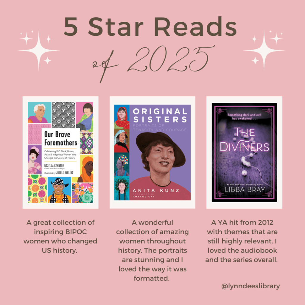 - The Diviners by Libba Bray: so I read the whole series in 2025 and overall the series is a 5 star series. I think the fact that this series, while debuting in 2012, still has relevant themes speaks to its longevity. The writing and character development were also well done–I found myself invested in the wellbeing of all of the main characters. I listened to most of the series on audiobook which I definitely recommend!